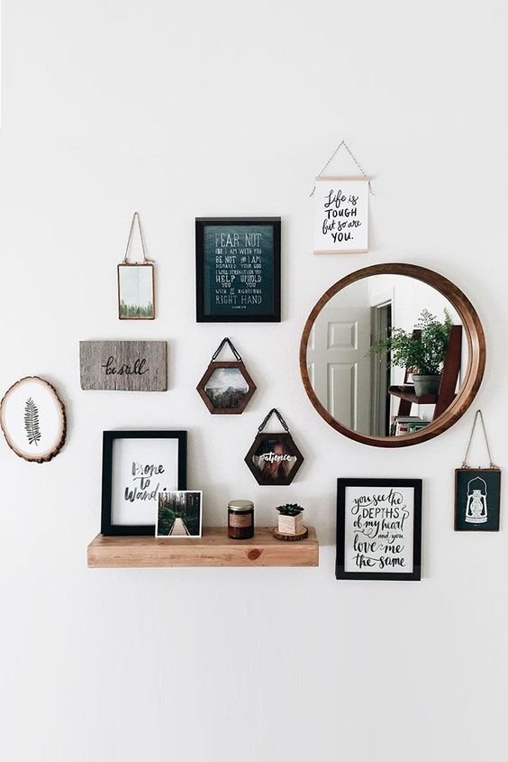Você pode optar por algo mais caótico ou mais alinhado. Uma opção é organizar a galeria a partir de um quadro principal e ir montando o restante como achar melhor, o importante é criar uma lógica de funcionamento entre eles.